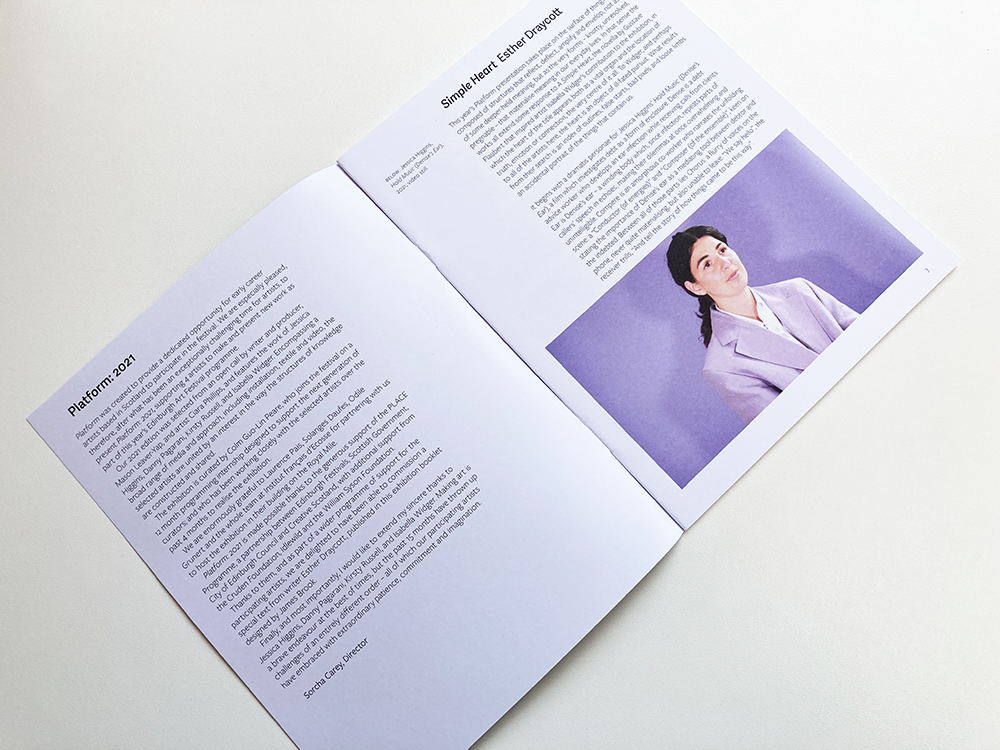A booklet that I designed for Platform, Edinburgh Art Festival’s showcase for Scotland based artists at the beginning of their careers. The 2021 edition, selected by Sorcha Carey, Mason Leaver-Yap and Ciara Phillips, and curated by Colm Guo-Lin Peare, brought together new work by Jessica Higgins, Danny Pagarini, Kirsty Russell and Isabella Widger. The exhibition ran from 29 July – 29 August and was held at the Institut français d’Ecosse West Parliament Square Edinburgh EH1 1RF
